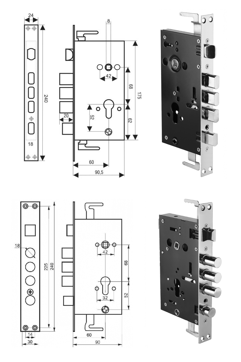 Замок врезной цилиндровый 674 с круглыми ригелями
