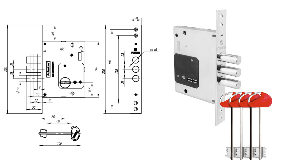 Замок врезной сувальдный Fuaro MDV25/S-60.00.3R16 (универсальное)