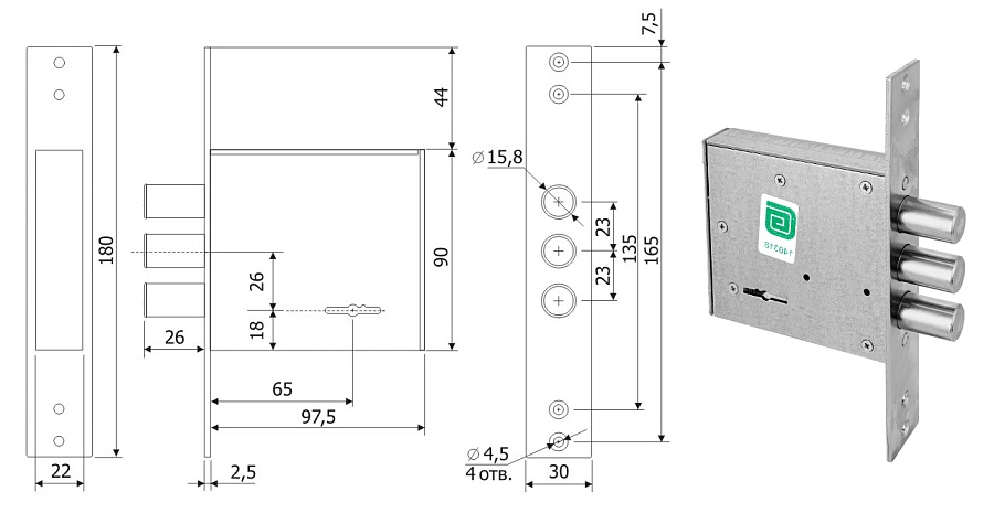 Два полуоборота, вылет ригелей - 26 мм. Баксэт - 65 мм