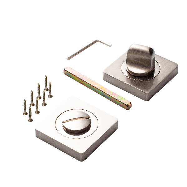 Завертка выполнена в стилистике дверных ручек, имеет тот же цвет, аналогичную форму розетки и снабжена удобным поворотным вертушком.