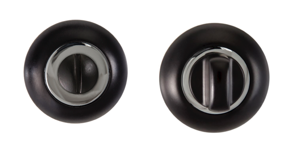 Завертка выполнена в стилистике дверных ручек, имеет тот же цвет, аналогичную форму розетки и снабжена удобным поворотным вертушком.